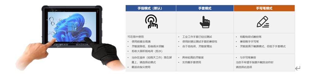 工作中,我们经常会碰到在户外阳光下无法看清楚屏幕内容,在冷库或者寒冷的室外,不得不脱掉手套进行操作,湿手的时候无法正确进行操控的痛苦经历。MC10 800nits的显示亮度、湿手模式和手套模式让你不再有这方面的烦恼,轻松应对。